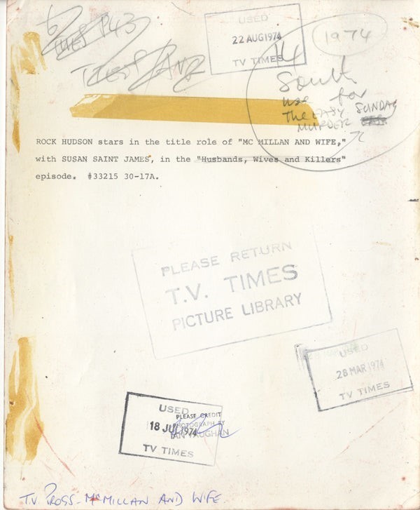 Rock Hudson, McMillan and Wife Original 8x10 Photo holding gun Stamped Snipe 1974 Good Condition (pinholes, surface marks, wear to edges) This item is an ORIGINAL 8x10 photo from the historic archives of Silver Screen Mementos. This original photograph was made in the actual year the film, television show or event was produced. The movie studios produced publicity photographs for distribution to the press, photo agencies and publicity departments to advertise the film/tv show or event. Very often original photos have press release information on the reverse of the photo - movie credits, description of the scene, event and people involved. This is a historic piece of cinema art and is being offered from one collector to another, no rights given or implied. Silver Screen are gradually releasing thousands of Original Photographs, Transparencies, Negatives, Lobby Cards, Posters, Magazines and other memorabilia from our historic archive.