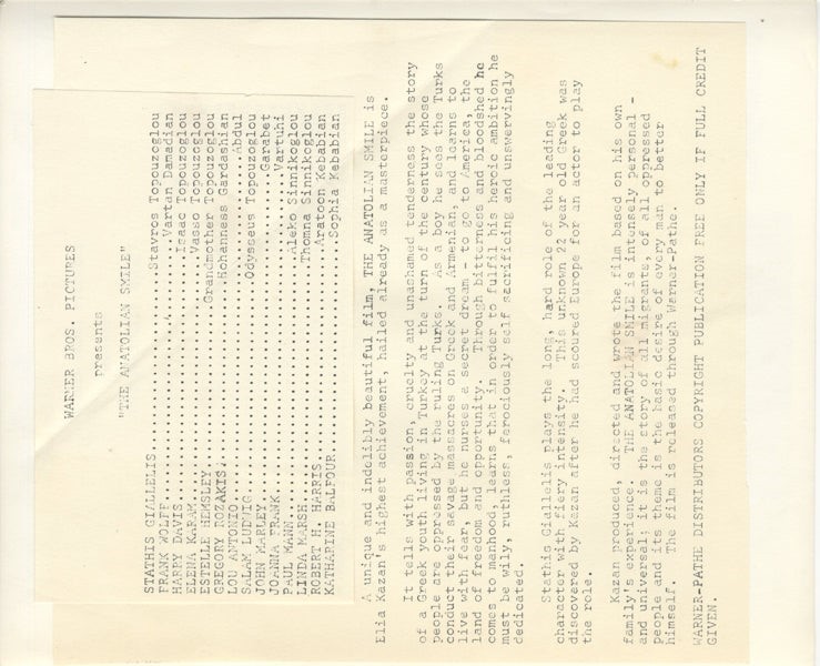 The Anatolian Smile America America 1963 Stathis Giallelis Elia Kazan film Original 8x10 Photo with paper caption snipe - VG/Near Mint This item is an ORIGINAL 8x10 photo from the historic archives of Silver Screen Mementos. This original photograph was made in the actual year the film, television show or event was produced. The movie studios produced publicity photographs for distribution to the press, photo agencies and publicity departments to advertise the film/tv show or event. Very often original photos have press release information on the reverse of the photo - movie credits, description of the scene, event and people involved. This is a historic piece of cinema art and is being offered from one collector to another, no rights given or implied. Silver Screen are gradually releasing thousands of Original Photographs, Transparencies, Negatives, Lobby Cards, Posters, Magazines and other memorabilia from our historic archive.