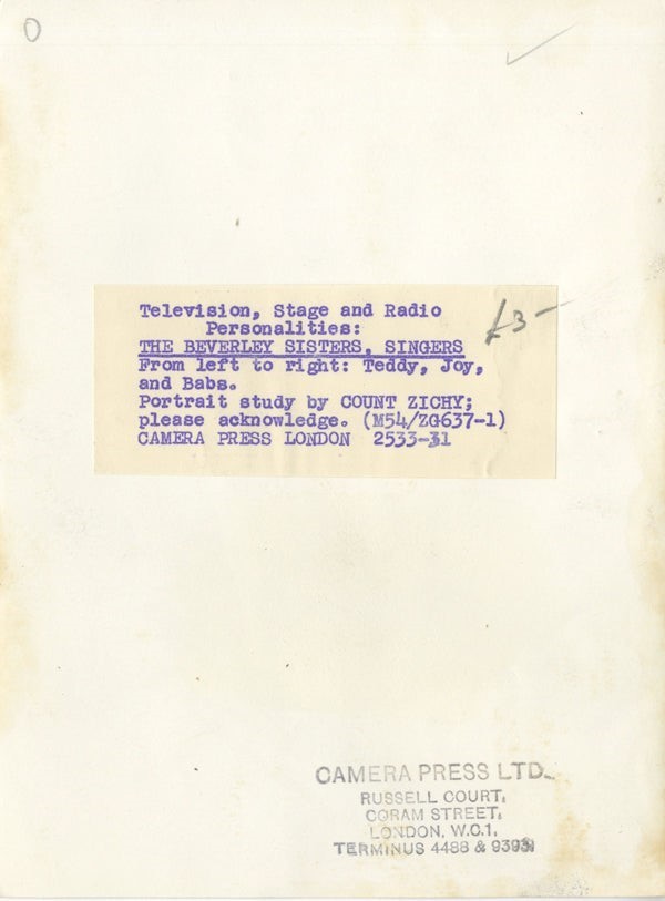The Beverley Sisters 1950's singing group Publicity Original 6x8 Photo Stamped with Snipe VG/Near Mint Condition This item is an ORIGINAL 8x10 photo from the historic archives of Silver Screen Mementos. This original photograph was made in the actual year the film, television show or event was produced. The movie studios produced publicity photographs for distribution to the press, photo agencies and publicity departments to advertise the film/tv show or event. Very often original photos have press release information on the reverse of the photo - movie credits, description of the scene, event and people involved. This is a historic piece of cinema art and is being offered from one collector to another, no rights given or implied. Silver Screen are gradually releasing thousands of Original Photographs, Transparencies, Negatives, Lobby Cards, Posters, Magazines and other memorabilia from our historic archive.