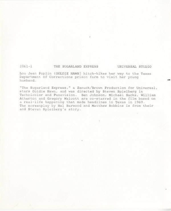 Goldie Hawn The Sugarland Express 1974 Publicity Original 8x10 Photo with Snipe Near Mint Condition This item is an ORIGINAL 8x10 photo from the historic archives of Silver Screen Mementos. This original photograph was made in the actual year the film, television show or event was produced. The movie studios produced publicity photographs for distribution to the press, photo agencies and publicity departments to advertise the film/tv show or event. Very often original photos have press release information on the reverse of the photo - movie credits, description of the scene, event and people involved. This is a historic piece of cinema art and is being offered from one collector to another, no rights given or implied. Silver Screen are gradually releasing thousands of Original Photographs, Transparencies, Negatives, Lobby Cards, Posters, Magazines and other memorabilia from our historic archive.