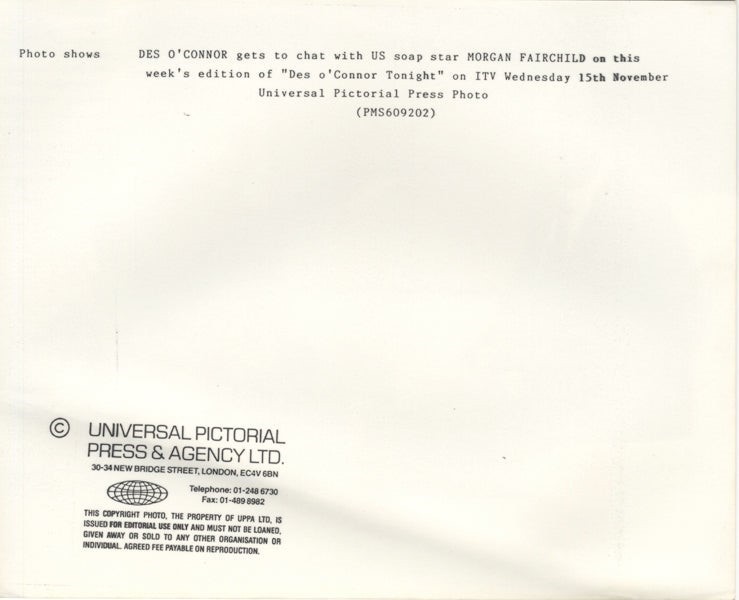 Morgan Fairchild, Des O'Connor Tonight Interview Original 8x10 Photo Stamped with Snipe Good/VG Condition (crease in corner) This item is an ORIGINAL 8x10 photo from the historic archives of Silver Screen Mementos. This original photograph was made in the actual year the film, television show or event was produced. The movie studios produced publicity photographs for distribution to the press, photo agencies and publicity departments to advertise the film/tv show or event. Very often original photos have press release information on the reverse of the photo - movie credits, description of the scene, event and people involved. This is a historic piece of cinema art and is being offered from one collector to another, no rights given or implied. Silver Screen are gradually releasing thousands of Original Photographs, Transparencies, Negatives, Lobby Cards, Posters, Magazines and other memorabilia from our historic archive.