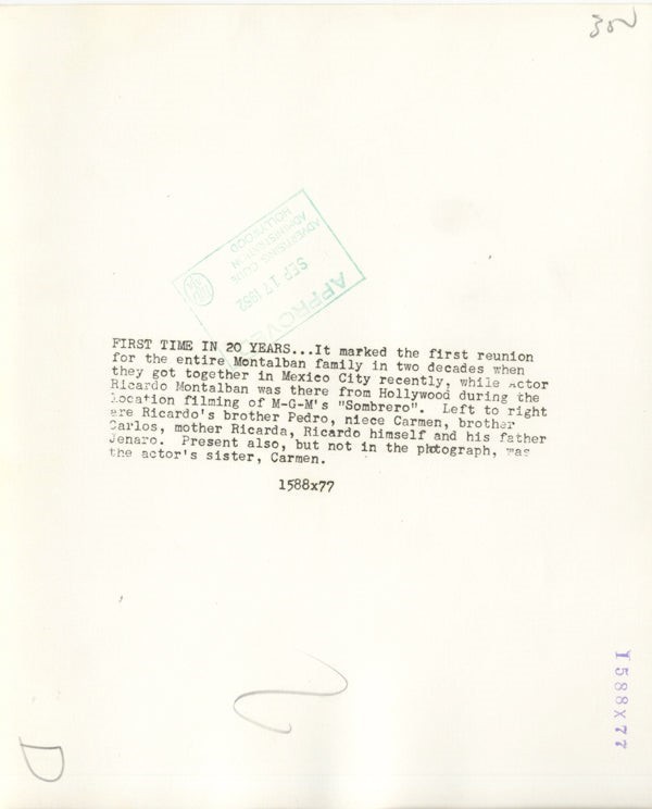 Ricardo Montalban&family Sombrero Publicity Original 8x10 Double Weight Silver Gelatin Photo Stamped with Snipe 1952 Near Mint Condition This item is an ORIGINAL 8x10 photo from the historic archives of Silver Screen Mementos. This original photograph was made in the actual year the film, television show or event was produced. The movie studios produced publicity photographs for distribution to the press, photo agencies and publicity departments to advertise the film/tv show or event. Very often original photos have press release information on the reverse of the photo - movie credits, description of the scene, event and people involved. This is a historic piece of cinema art and is being offered from one collector to another, no rights given or implied. Silver Screen are gradually releasing thousands of Original Photographs, Transparencies, Negatives, Lobby Cards, Posters, Magazines and other memorabilia from our historic archive.