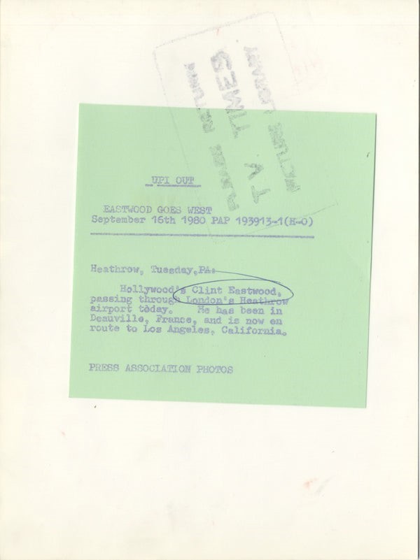 Clint Eastwood Candid Heathrow Airport London Original 7x9 approx Photo Stamped Snipe 1980 Near Mint Condition This item is an ORIGINAL 8x10 photo from the historic archives of Silver Screen Mementos. This original photograph was made in the actual year the film, television show or event was produced. The movie studios produced publicity photographs for distribution to the press, photo agencies and publicity departments to advertise the film/tv show or event. Very often original photos have press release information on the reverse of the photo - movie credits, description of the scene, event and people involved. This is a historic piece of cinema art and is being offered from one collector to another, no rights given or implied. Silver Screen are gradually releasing thousands of Original Photographs, Transparencies, Negatives, Lobby Cards, Posters, Magazines and other memorabilia from our historic archive.