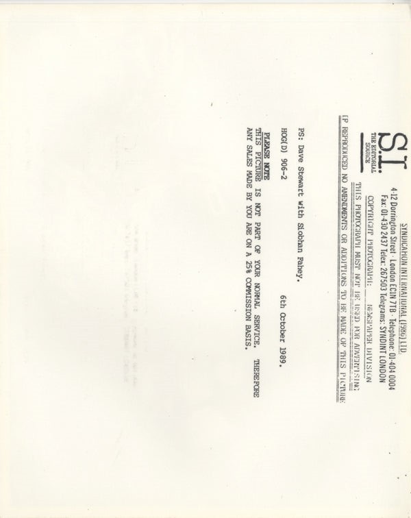 The Eurythmics Dave Stewart kissing Siobhan Fahey Original 8x10 Photo Stamped with Snipe 1989 Near Mint Condition This item is an ORIGINAL 8x10 photo from the historic archives of Silver Screen Mementos. This original photograph was made in the actual year the film, television show or event was produced. The movie studios produced publicity photographs for distribution to the press, photo agencies and publicity departments to advertise the film/tv show or event. Very often original photos have press release information on the reverse of the photo - movie credits, description of the scene, event and people involved. This is a historic piece of cinema art and is being offered from one collector to another, no rights given or implied. Silver Screen are gradually releasing thousands of Original Photographs, Transparencies, Negatives, Lobby Cards, Posters, Magazines and other memorabilia from our historic archive.